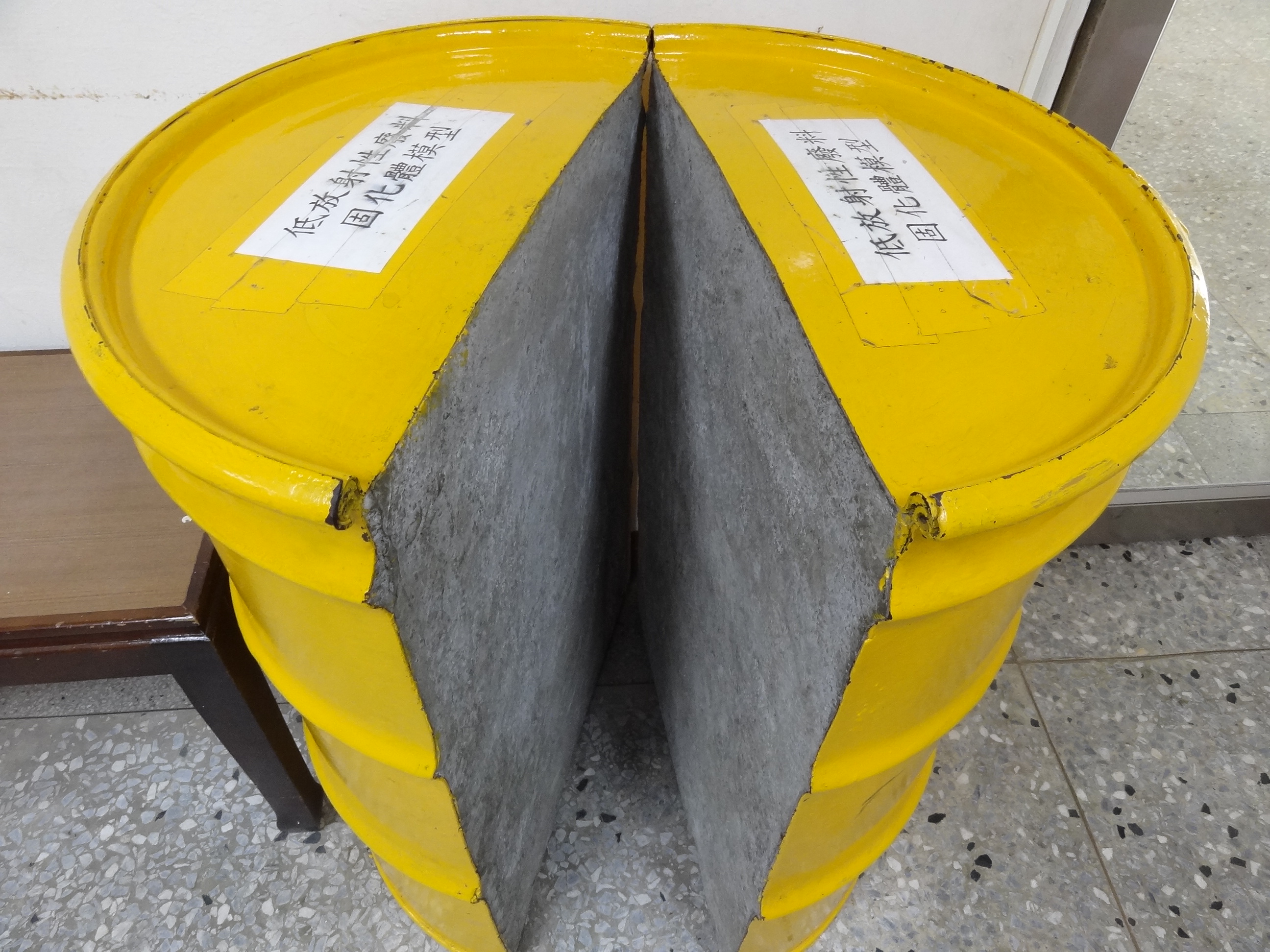 放在蘭嶼的核廢料是低階的,我看到貯存桶「樣品模型」。樣品模型顯示是用一般鐵桶,外表漆成黃色,裡面是核能電廠使用過的物品,例如:工作服、鞋子、抹布,和水泥混在一起,灌到鐵桶裡。在1996年之後,蘭嶼人不收核廢料,後來產生的低階核廢料就存在核一、核二、核三廠裡。聽說目前可以減少容積到2%,但經過十多年,數量仍是可觀的。