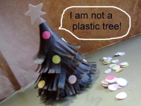 用舊的書店紙袋與打洞機廢紙製作的小聖誕樹。