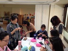 看著這儼然小型代工廠的場景:有媽媽帶小孩一起來,媽媽勾清潔刷、小孩在一旁寫功課;還有媽咪一邊學清潔刷,小小孩肚子餓了直接在現場就哺乳了起來。