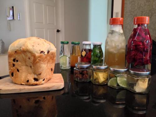 現在好老闆真的少,愛地球又愛員工的好老闆更是稀有動物一定要好好保護。於是我二話不說就接了邀約,之後就開始動腦筋,前天終於全部計畫好!我先去買了檸檬/鳳梨/牛奶/香蕉/黑糖等5罐香精。然後再把從主婦聯盟合成社買來很熟的鳳梨/香蕉/檸檬(這樣才夠香),切塊得分別裝罐,再加上早上剛出爐的葡萄乾全鮮奶吐司(用來對比牛奶香精)。最後把家裡所有的玻璃瓶找出來,分別用白開水泡上有機食用玫瑰花/蜂蜜蘋果醋/薄荷羅勒迷迭香/瑪黑兄弟皇家婚禮茶包/後壁黑糖/檸檬片(照片由右到左),準備好這些瓶瓶罐罐跟現做吐司,早上8:30便浩浩蕩蕩出門去。