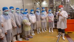 參觀食品工廠的前置作業很嚴謹,先要穿著規定工作衣鞋通過數道消毒、清潔手續,才得以前進工作基地。為確保食品安全參訪全程由品管工作人員帶領解說,嚴禁拍照與觸摸機具、食材,加工廠分區域進行各種工作,有高溫、低溫、高噪音及品管區,一趟參訪下我們不由得不替工廠員工擔憂,長期在特殊環境工作是否能適應與保持身心健康狀態?
