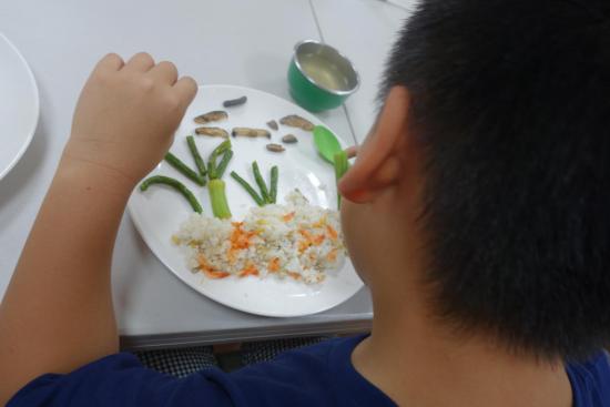 讓學員擺出屬於自己的菇菇飯,小朋友一個個排隊自己盛飯,再將各式材料畫成一幅美景,有外星人、大樹、香菇超人等等,原來讓孩子愛上米,這麼簡單。