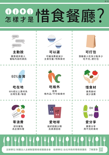 去年,我們與師範大學環境教育研究所的同學透過拜訪多個餐廳和討論後,共同擬出希望能鼓勵餐飲業者實踐的9個「惜食餐廳」項目,內容從食材的選擇及利用、食材或餐點的資訊揭露、餐點份量選擇及剩餘食材分享。而且,為鼓勵更多餐廳參加,餐廳只須符合其中3個或以上項目即可: