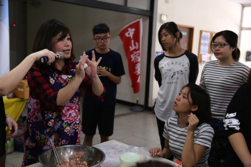 低碳飲食要在地、要得時,林詩敏老師準備當季高麗菜、青蔥、在地的豬絞肉、蝦子等食材,帶全班同學手作低碳美味的水餃。從洗菜、切菜開始,詩敏老師悉心講解一顆水餃的製作細節,如處理蔬菜時的刀功,以刀尖為施力點作弧形的來回碎切,是讓高麗菜更細碎的刀法。