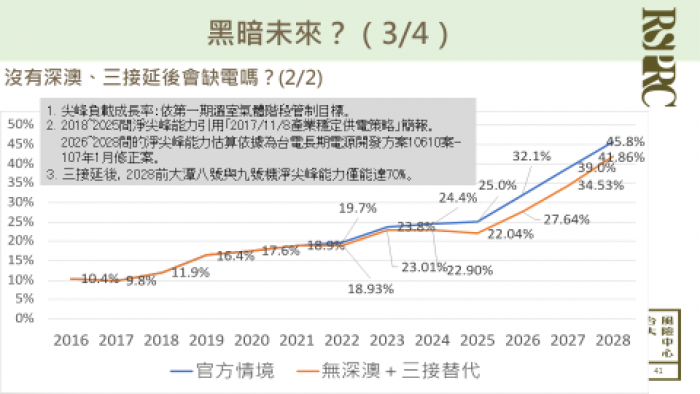 趙博士也分享了他的研究,在兩種推估情境下,可以看到我們已開始脫離備轉容量緊張的時期,他也推估台灣的備用容量在沒有深澳及三接的情境下,最差也有13.6%,甚至有20%以上,目前法定值為15%,是依據2010年陳士麟教授的研究,但陳教授在後來2016年所指導的碩士論文則指出,可以降到10~12%即可。