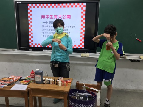 香甜好滋味的橘子汽水,是用新鮮的橘子汁加上沁涼的氣泡水製成的嗎?不~不~不~讓我們一同發現「飲料裡的壞魔法-橘子汽水實驗」的奧秘,準備材料有一杯水、色素、橘子香精、檸檬酸、小蘇打粉依序加入水中攪一攪,橘子汽水大功告成,猶如變魔術般的神奇快速,學童看了目不轉睛的說:「太可怕了吧,幾滴的色素就染黃整杯清水,以後不敢喝了」。