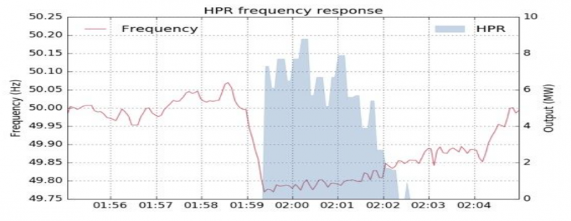 (圖1: HPR儲能系統供電,拯救急遽下降的電網頻率。HPR, Hornsdale Power Reserve為澳洲的儲能系統,由TESLA的電池建置而成。來源:Renew Economy)
