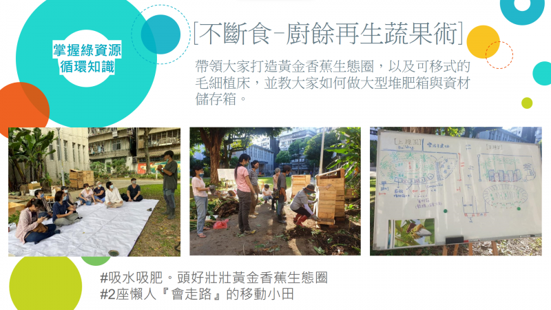 C. 資源循環再利用工作坊:帶領大家打造黃金香蕉生態園,以及可移式的毛細植床,並教大家如何做大型推肥箱與資材儲存箱。
