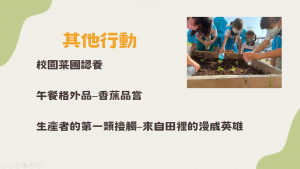 除了課程之外,鹿東國小也推動班級的惜食行動,每個班級導師與孩子們討論後自訂各班惜食目標,鼓勵全體孩子們自發性的為了惜食做出努力。另外也有校園菜圃認養、午餐格外品--香蕉品嘗、生產者的第一類接觸--來自田裡的漫威英雄等其他行動,讓孩子們透過真實接觸來認識並了解食物、土地、與惜食議題之間的關聯。