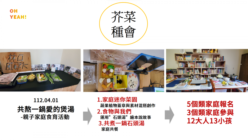 A. 芥菜種會:共熬一鍋愛的煲湯--親子家庭食育活動:透過家庭迷你菜園蔬果植物蓋章、石頭湯繪本說故事,以及最後火鍋共食的活動,來完成這堂課程。
