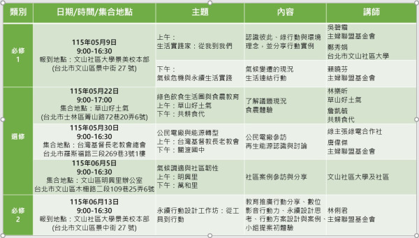 綠色飲食與食農教育、公民電廠與能源轉型、氣候調適與社區韌性